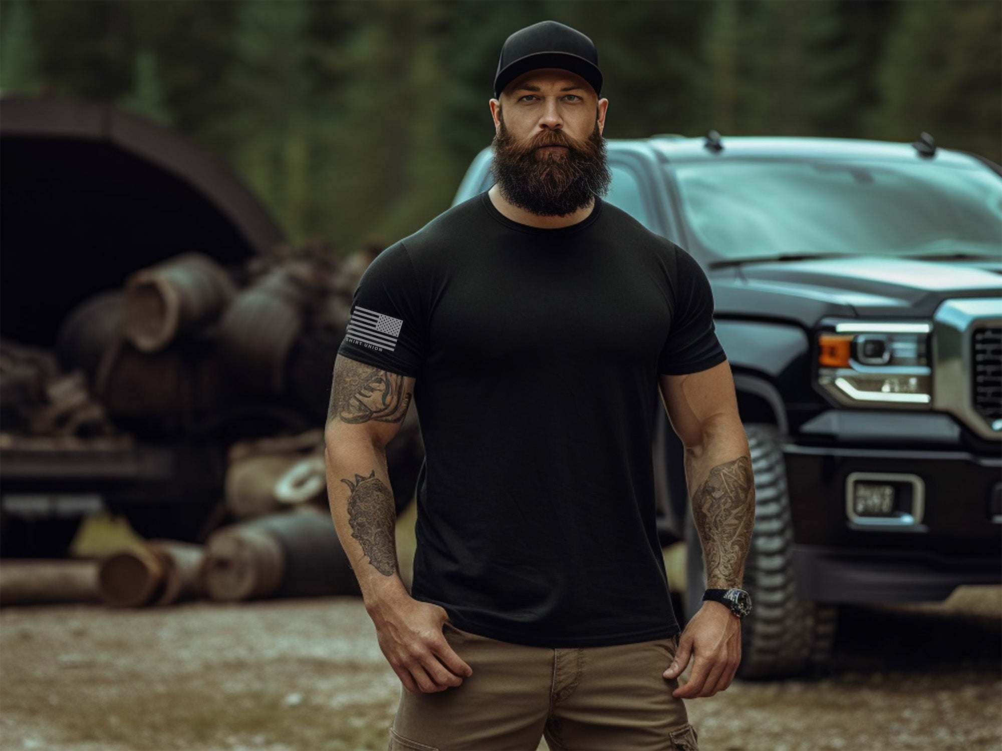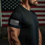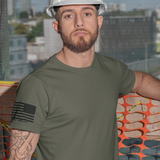 No screaming eagles. No fireworks. Just a clean, rugged shirt you can wear anywhere—with the American flag printed proudly on your right sleeve.